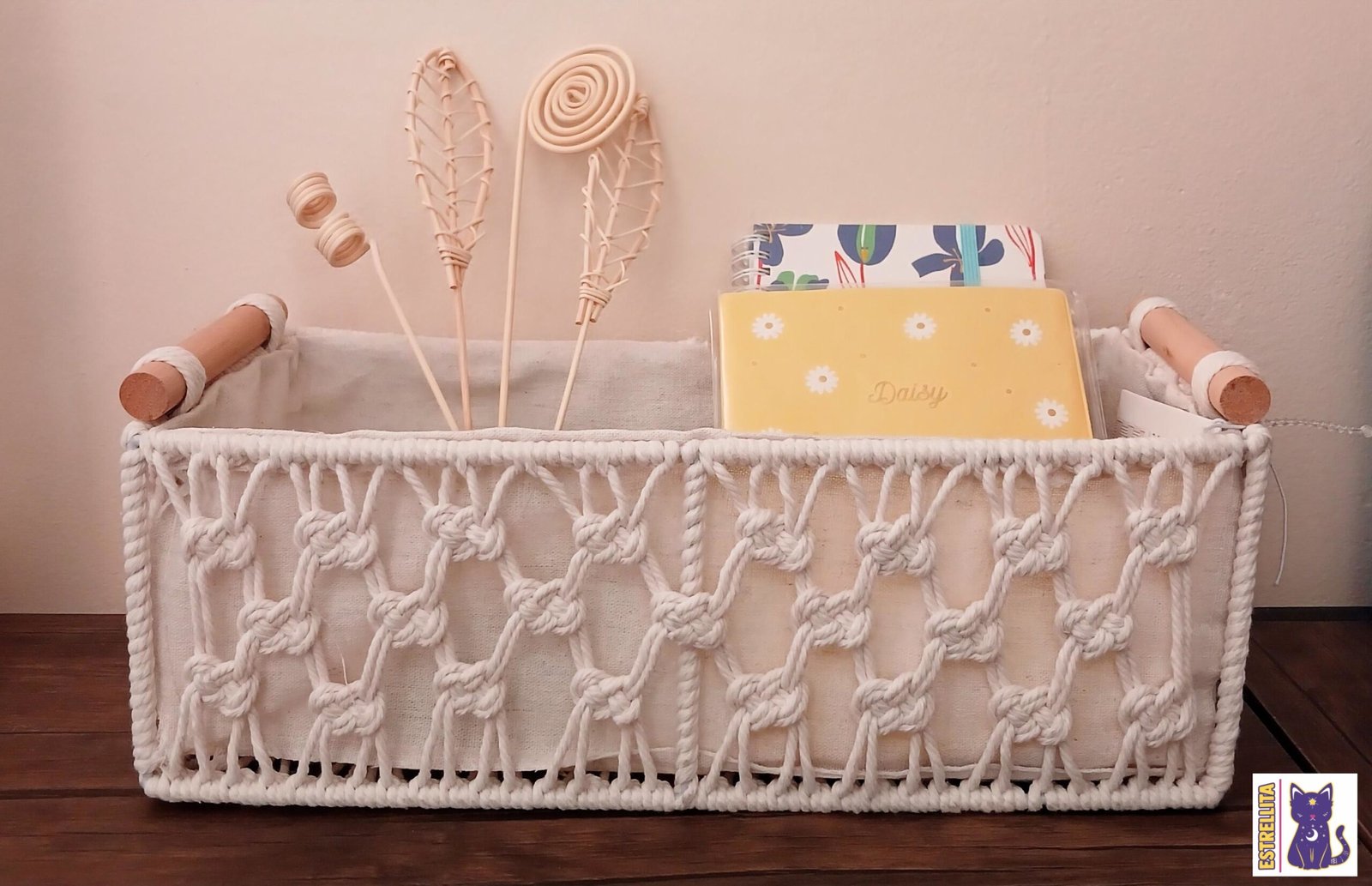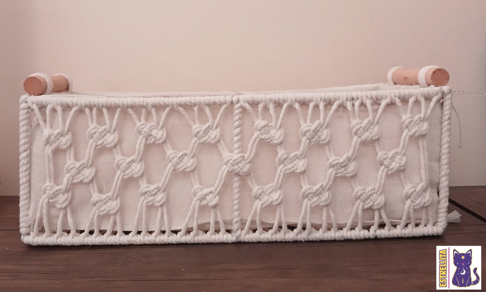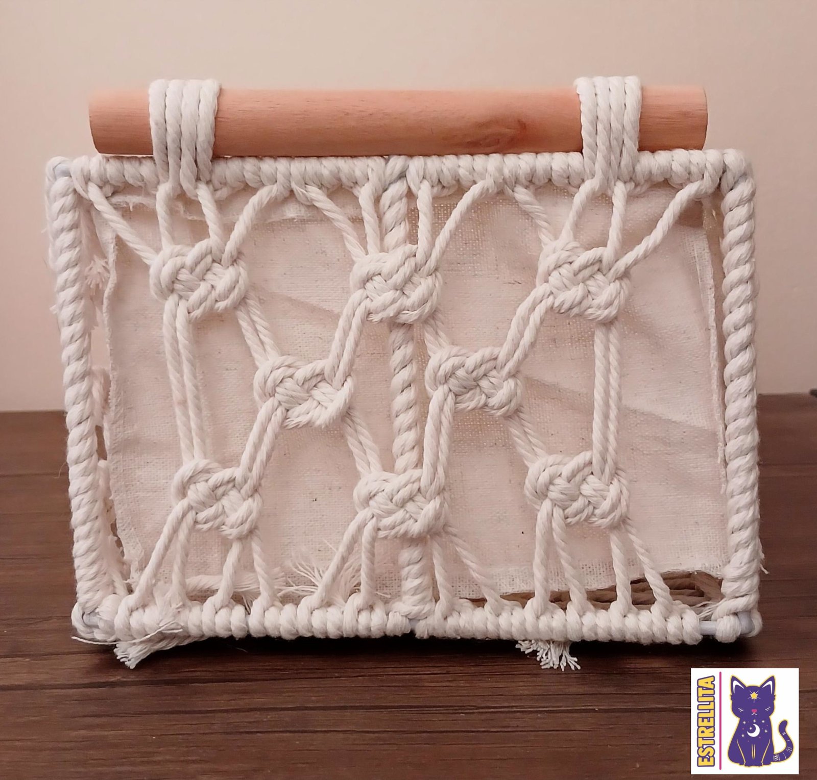 Caja fabricada con soportes de alambre y un forro de tela en color beige. Está opción incluye asas de madera para un mejor agarre, una bella decoración de macramé y no incluye tapa. Añade un toque rústico y elegante, gracias a que es muy versátil puede colocarse en el baño, cocina, lavandería o en cualquier sección del hogar.