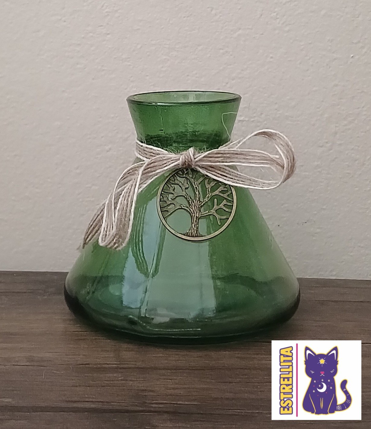Esta pieza de vidrio en color verde incluye un dije del Árbol de la Vida, el cual es un símbolo con profundo significado. Las raíces representan nuestro origen y la familia; mientras que las ramas hablan de la evolución, apertura al mundo y el futuro. Suma esta energía de equilibrio a tus espacios. Ideal para lucir flores, ramas secas.